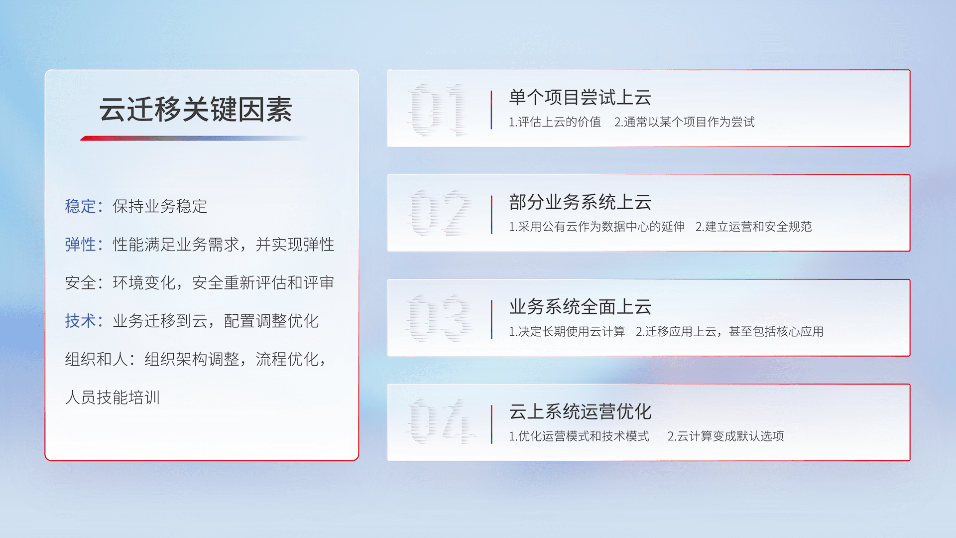 结合实际业务,,,,从规划设计、、云平台选型、、云原生改造、、数据迁移、、、集成交付,,,,迁移全过程为客户识别最佳上云路径,,做好风险识别管理,,,设计网络架构、、、、身份权限、、、、安全审计合规、、、、操作审计、、、日志审计、、监控告警策略、、、多站点容灾设计等,,,,对云上基础设施进行整体规划,,,提升IT治理水平,,,,以满足弹性、、高可用、、、、高性能的需求。。。