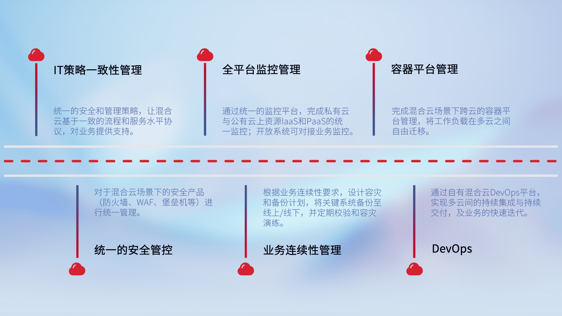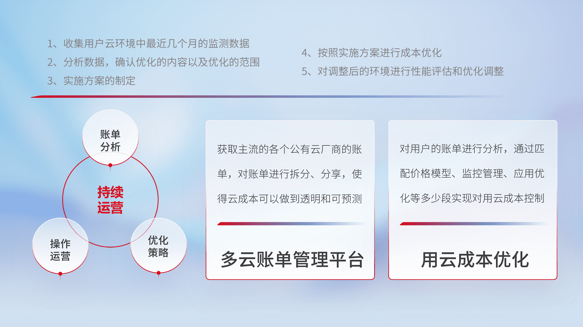 通过多云纳管,,,以统一的资源数据模型把客户的云资源进行抽象和封装,,,,进而实现对多云资源的统一操作,,,保障云资源管理的可靠性、、、稳定性与可用性。。。量身定制化运维内容,,,,配置、、、开发运维、、、补丁管理、、备份、、、监控、、、、认证和访问管理、、审计和日常巡检等,,,,保障在用云过程中的可靠度,,,,稳定度以及高可用率。。。。
