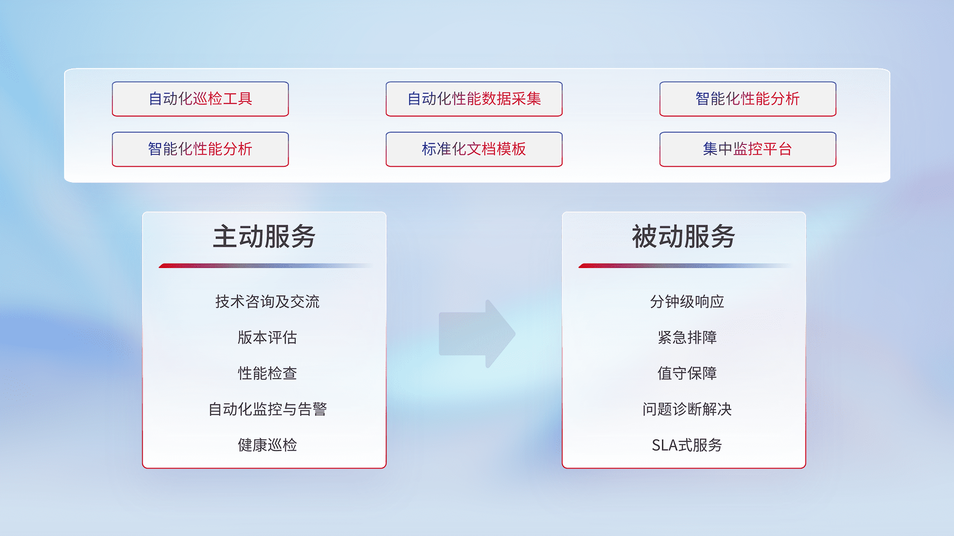 智能化工具和标准化文档,,保障服务质量,,,,提供主动服务(包含技术咨询、、版本评估、、、、性能检查、、、自动化监控与告警、、健康巡检)和被动服务包含(分钟级响应、、紧急排障、、值守保障、、问题诊断解决、、、SLA服务)。。。。